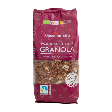 Granola med sprød banan, kakao og kokos, GF, Økologisk - 250 Gram - Madame Butterfly